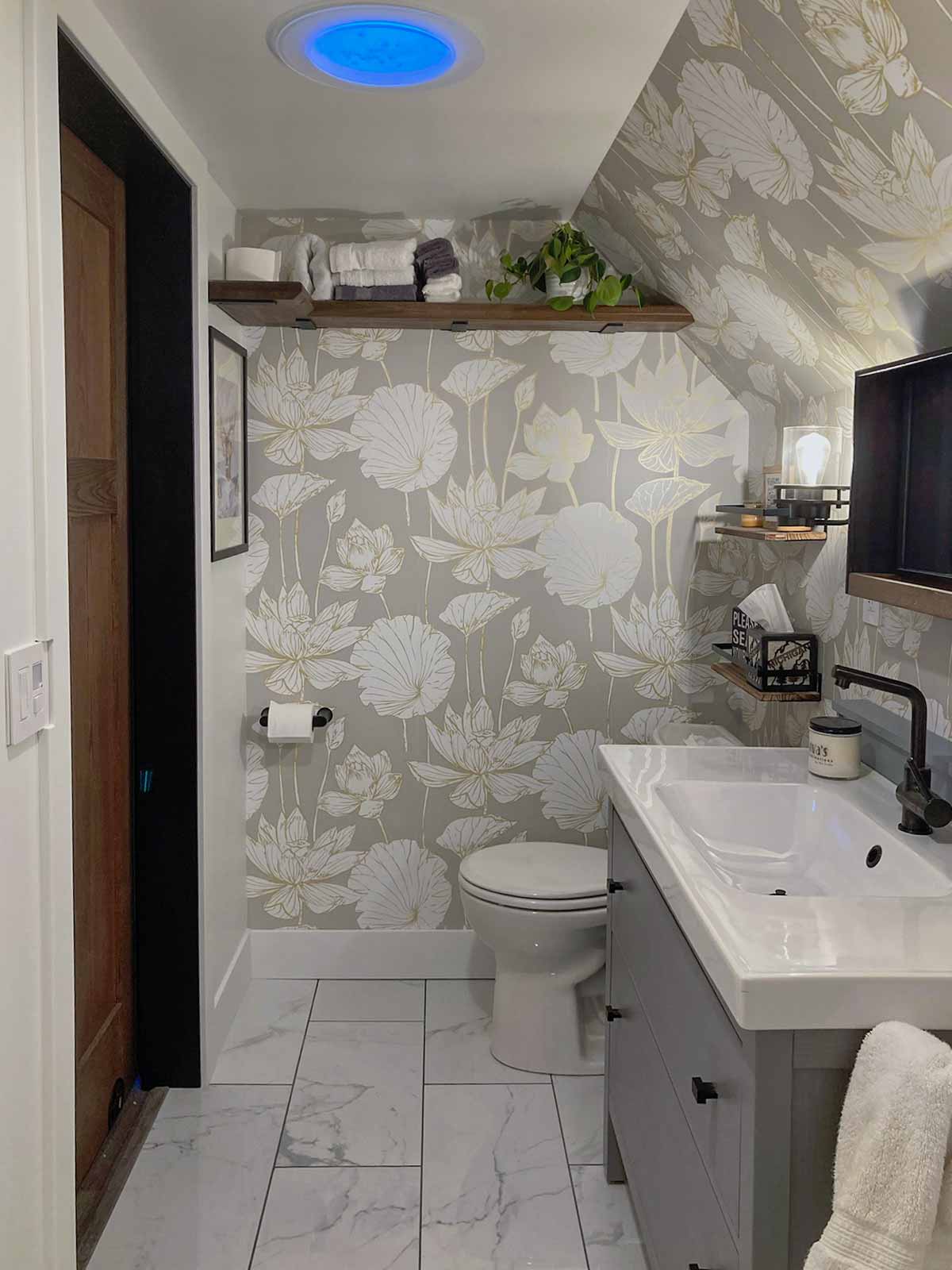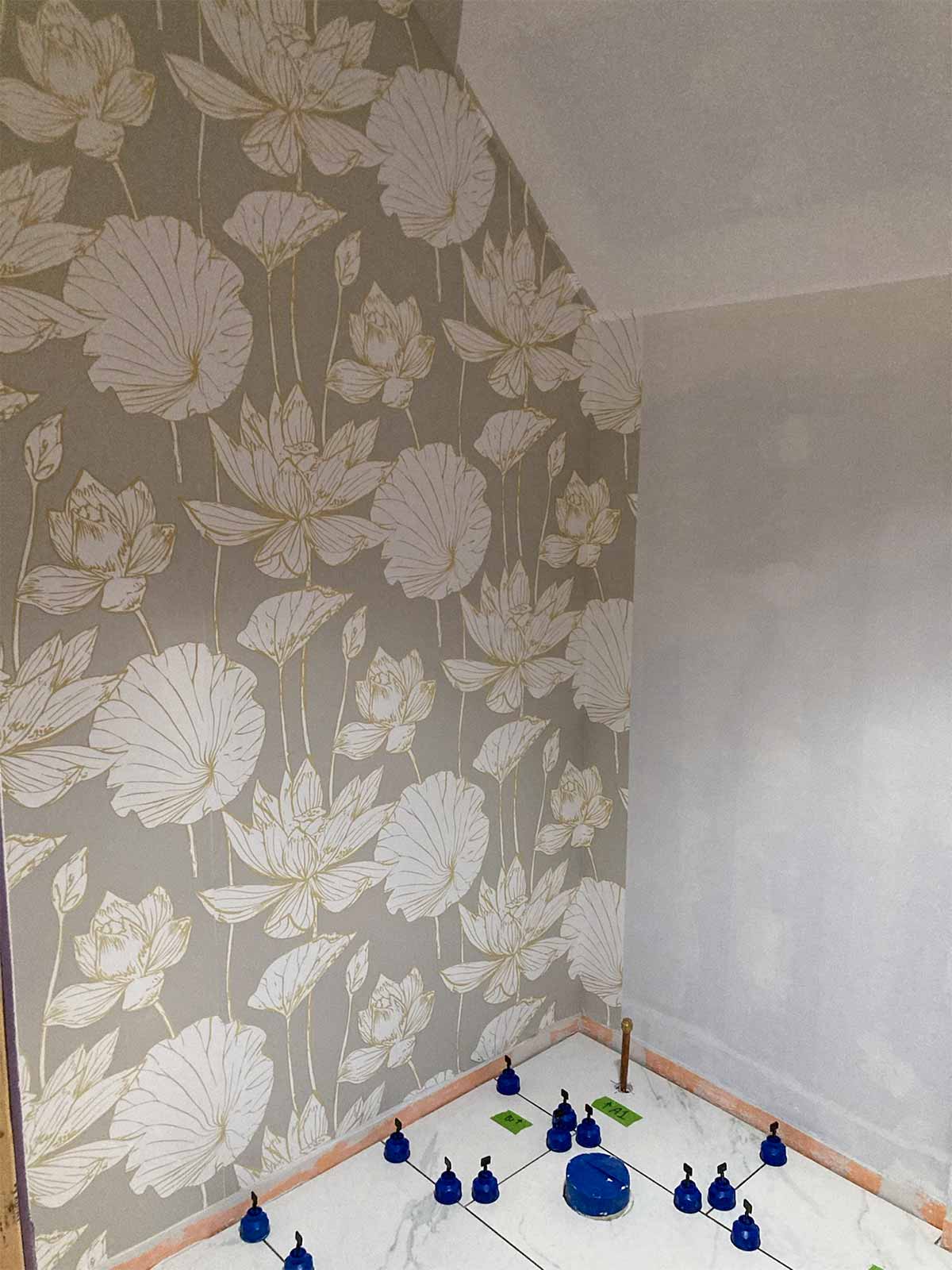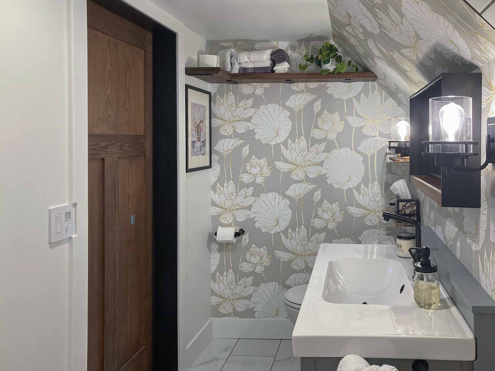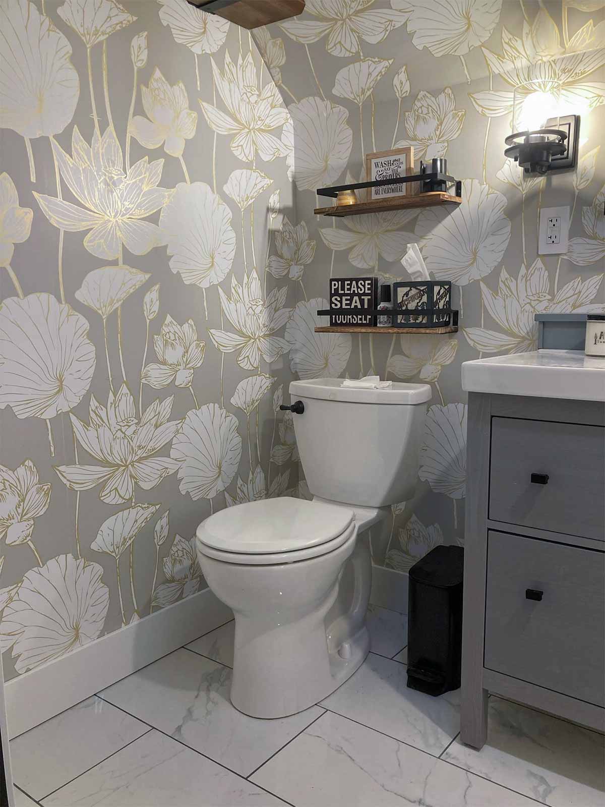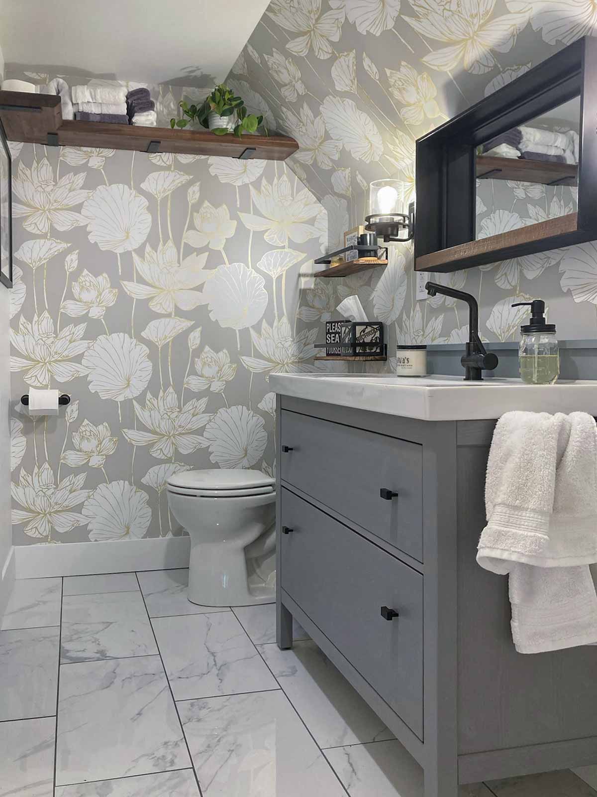 - Wallpaper purchased on Amazon: NextWall Lotus Floral metallic gold and gray