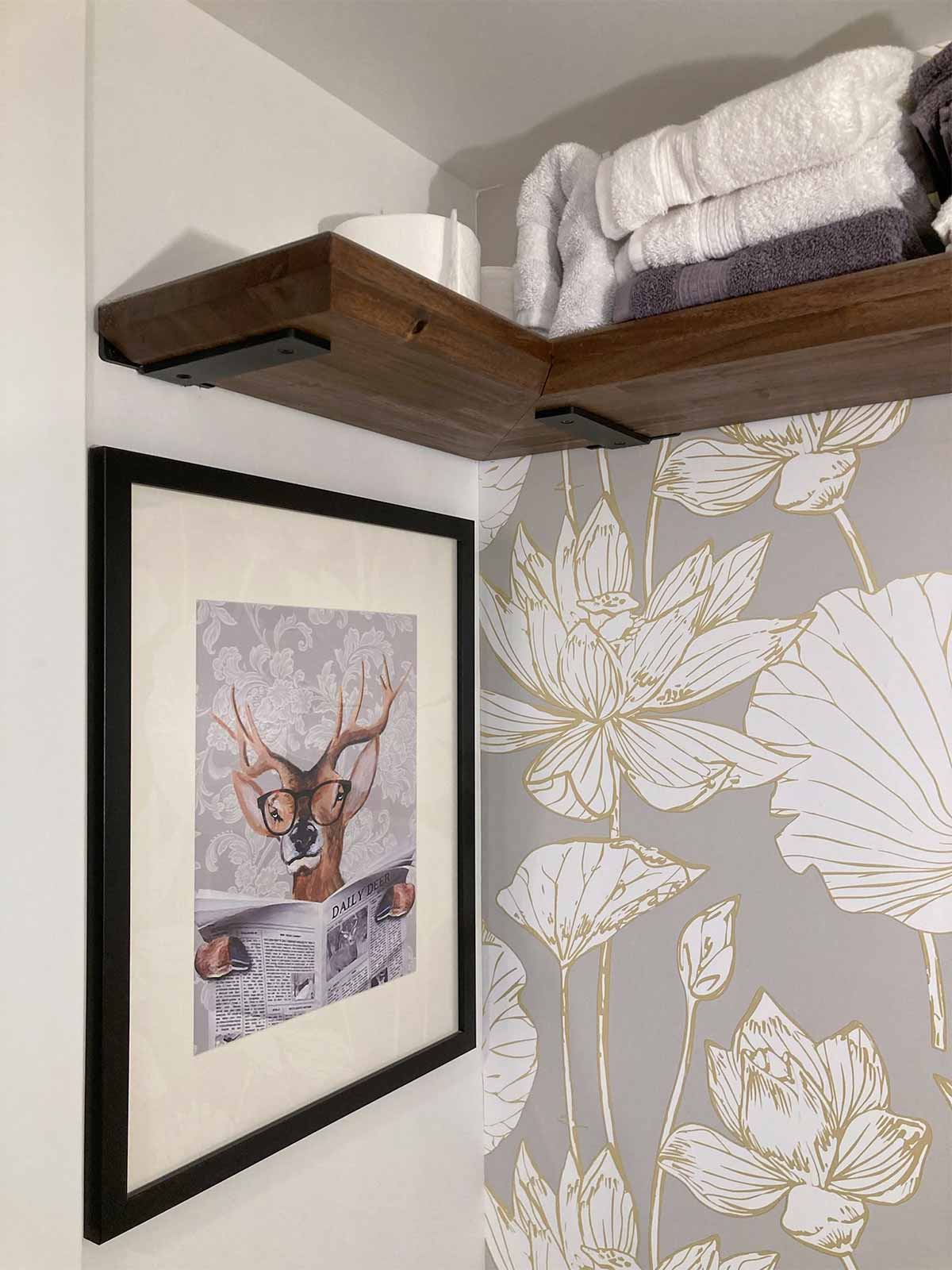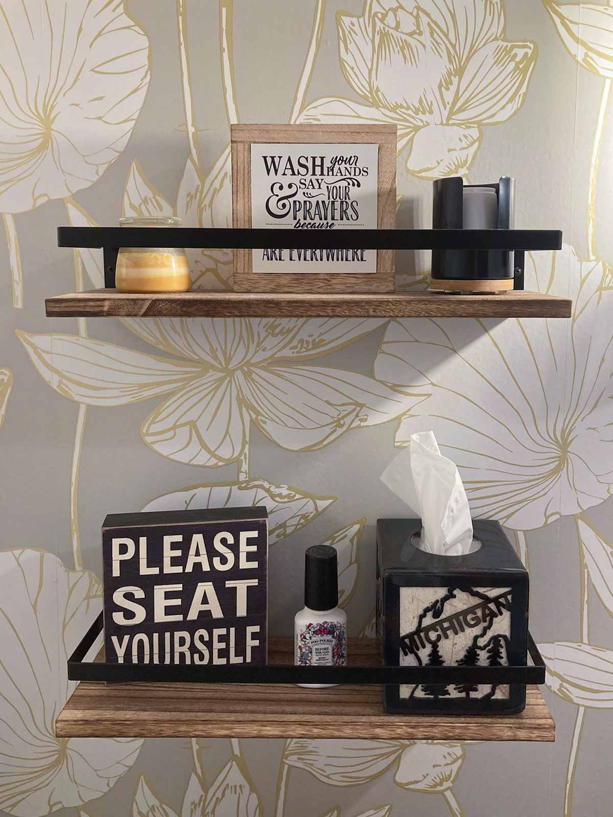 - Shelves above the toilet from Amazon: Peter's Goods Rustic Floating Wall Shelves.