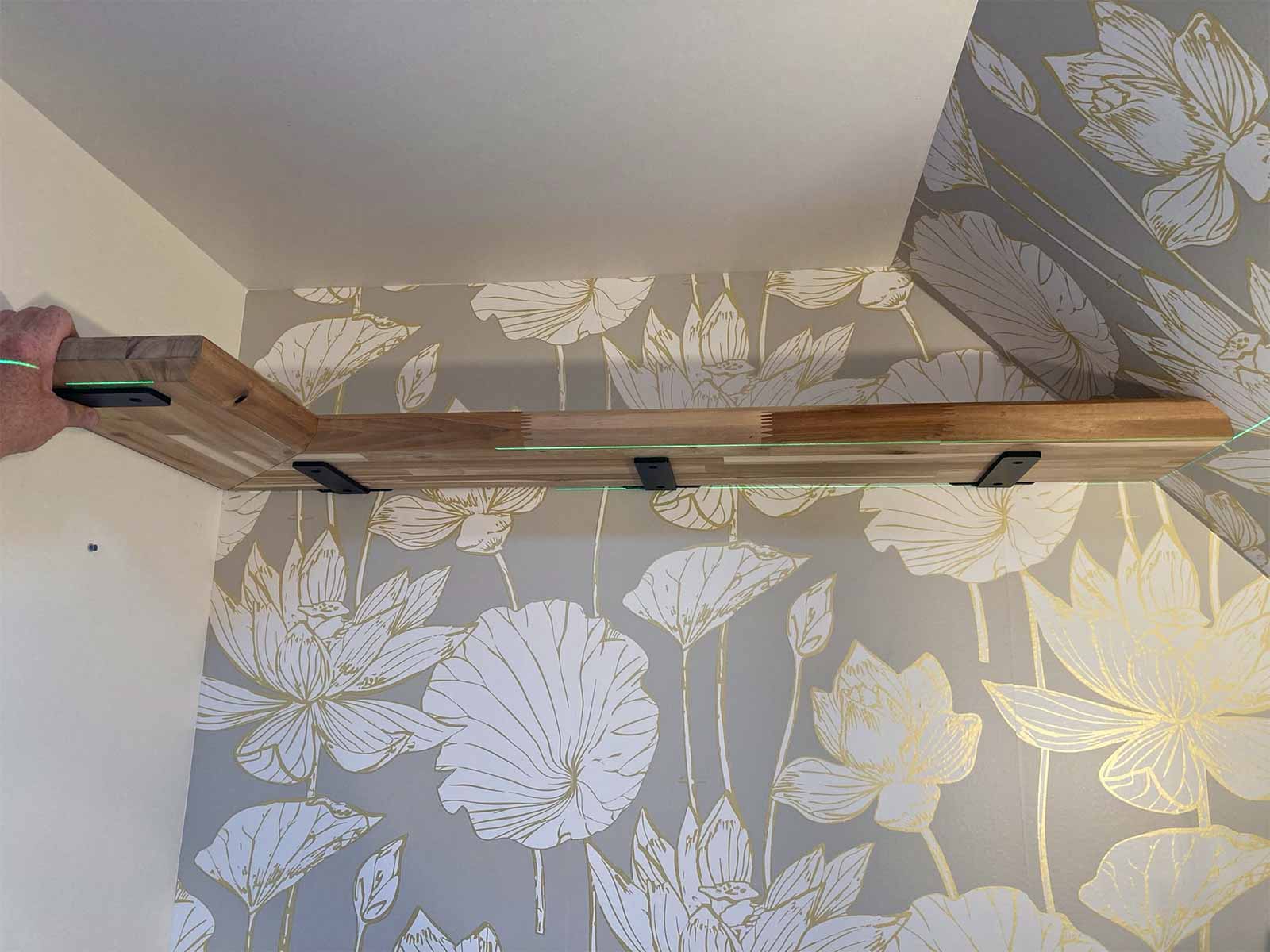 - The shelf is custom made from a leftover piece of the butcher block used for the dining room table. We purchased black heavy duty metal brackets for supports.