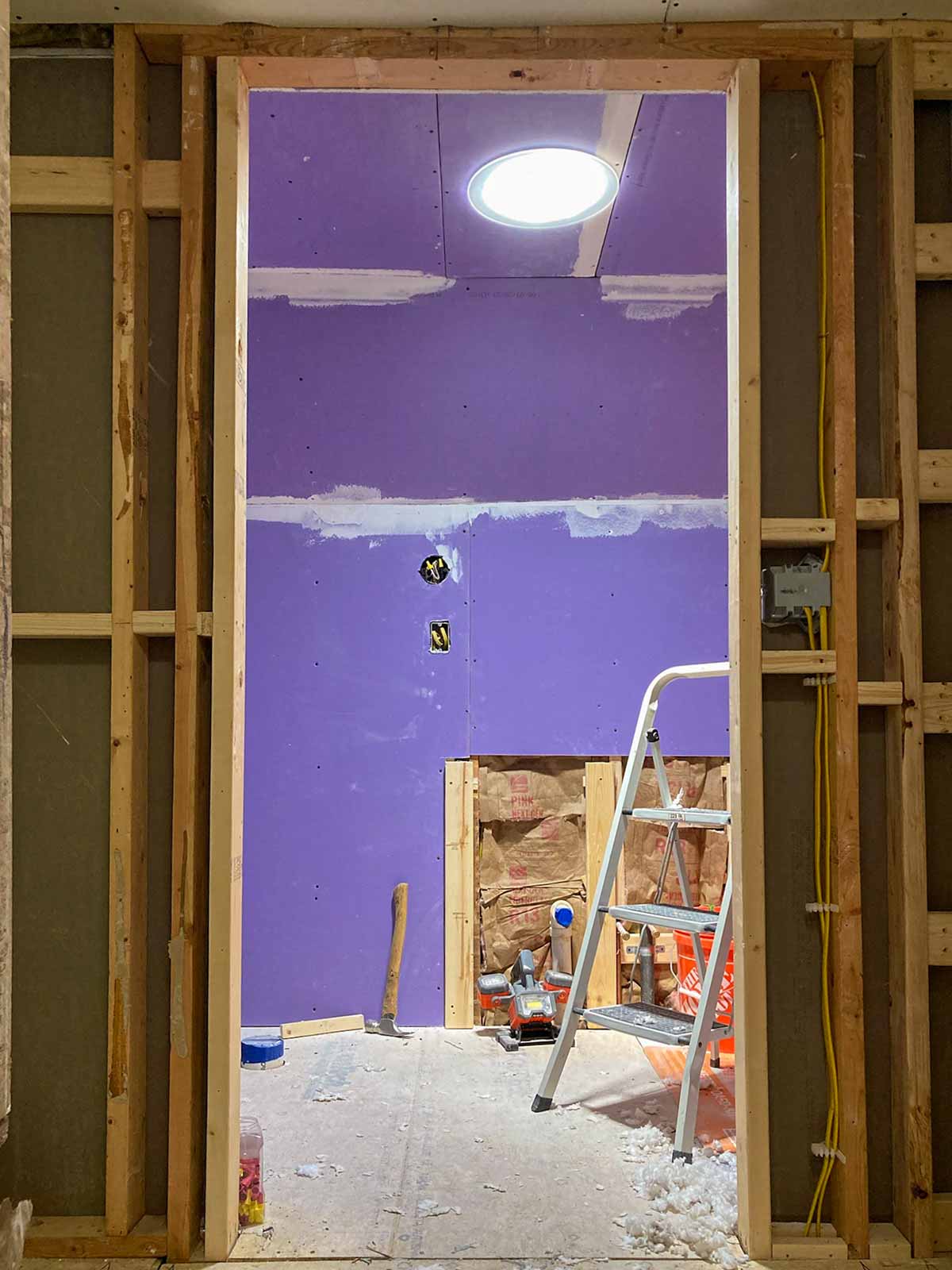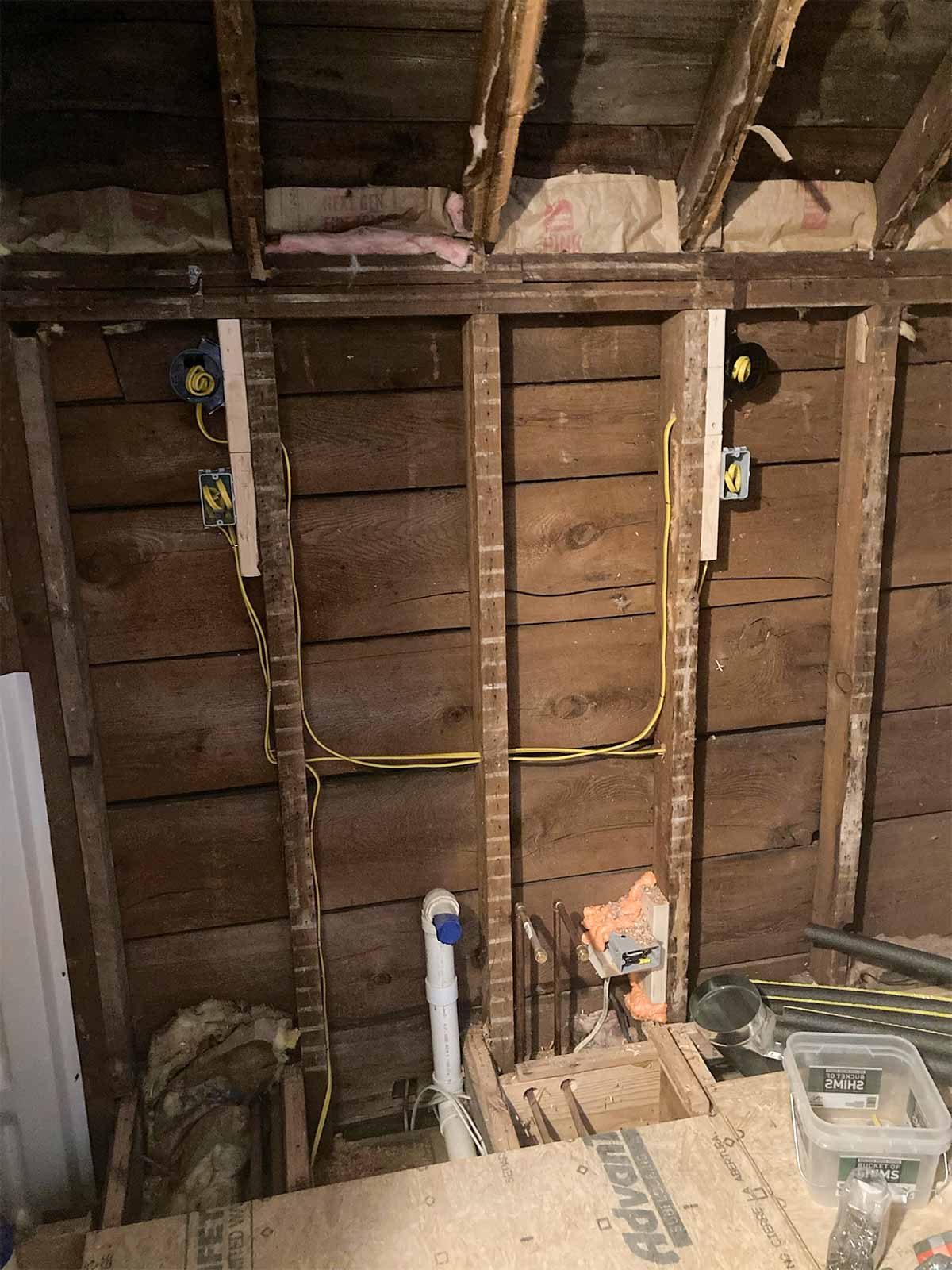 While the floor was still open, Andy worked on running wiring for the outlets, sconces, and exhaust fan, down into the basement. He also ran a wire down to the kitchen for the new microwave. Thinking ahead!
