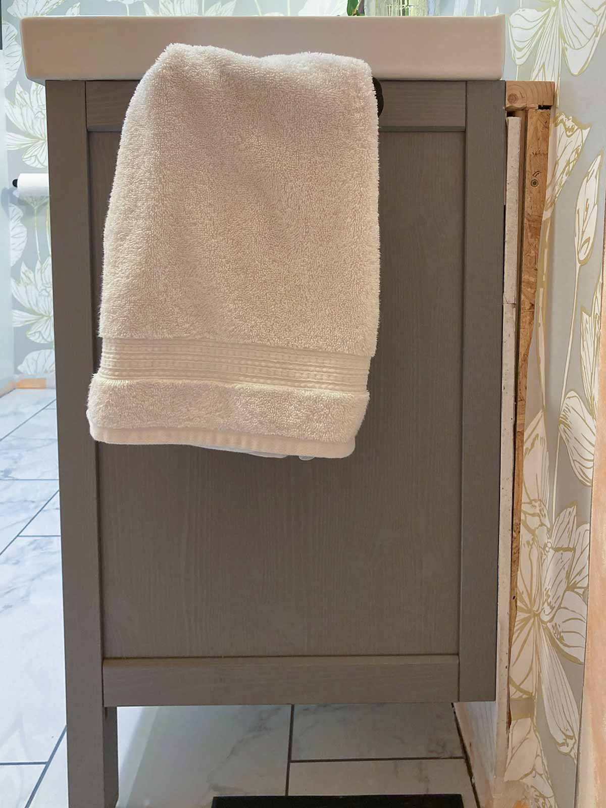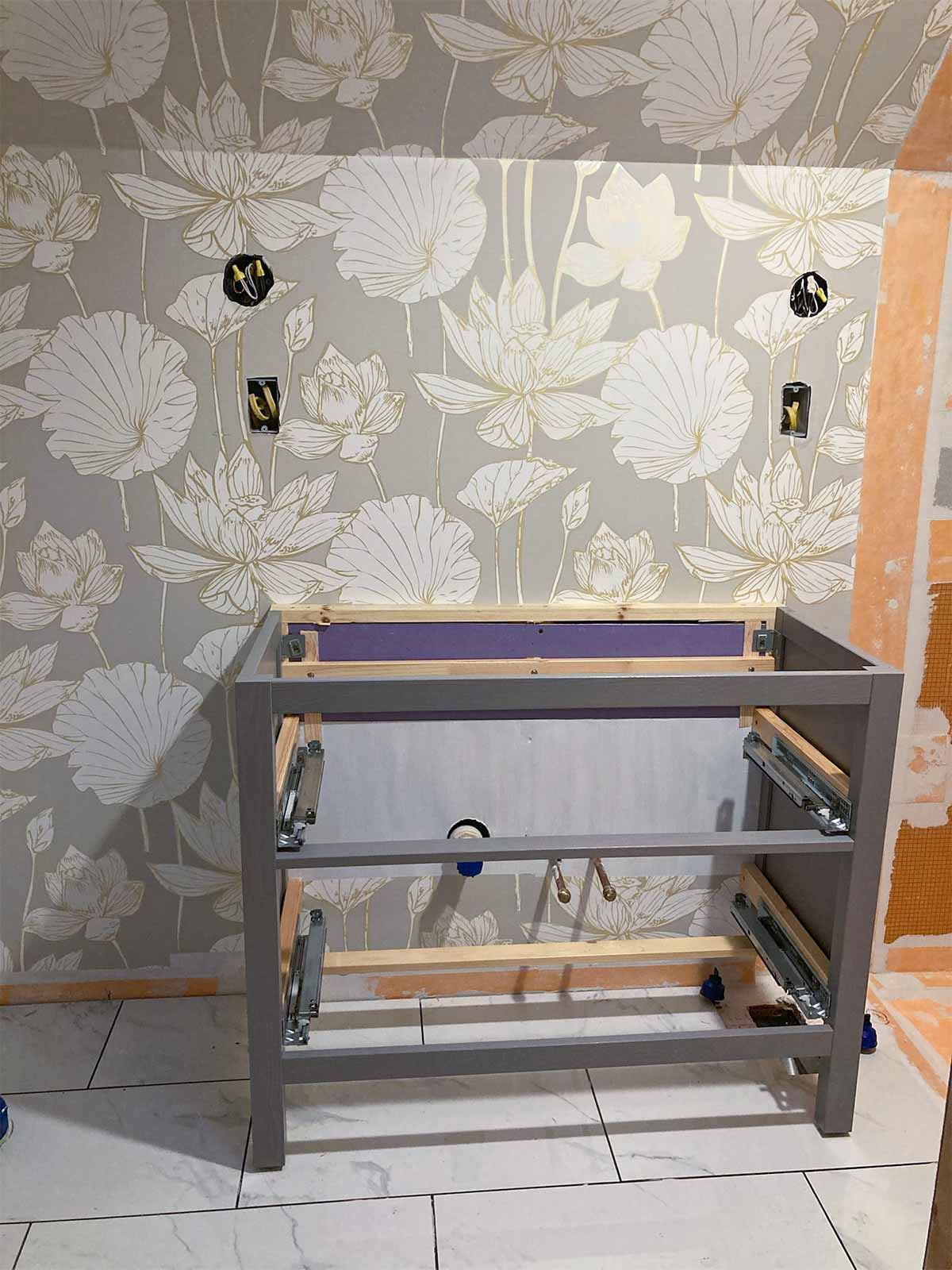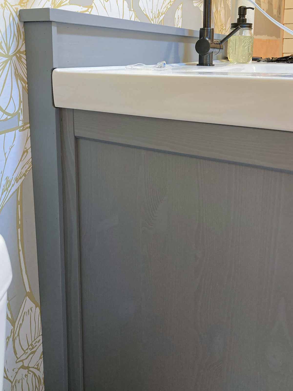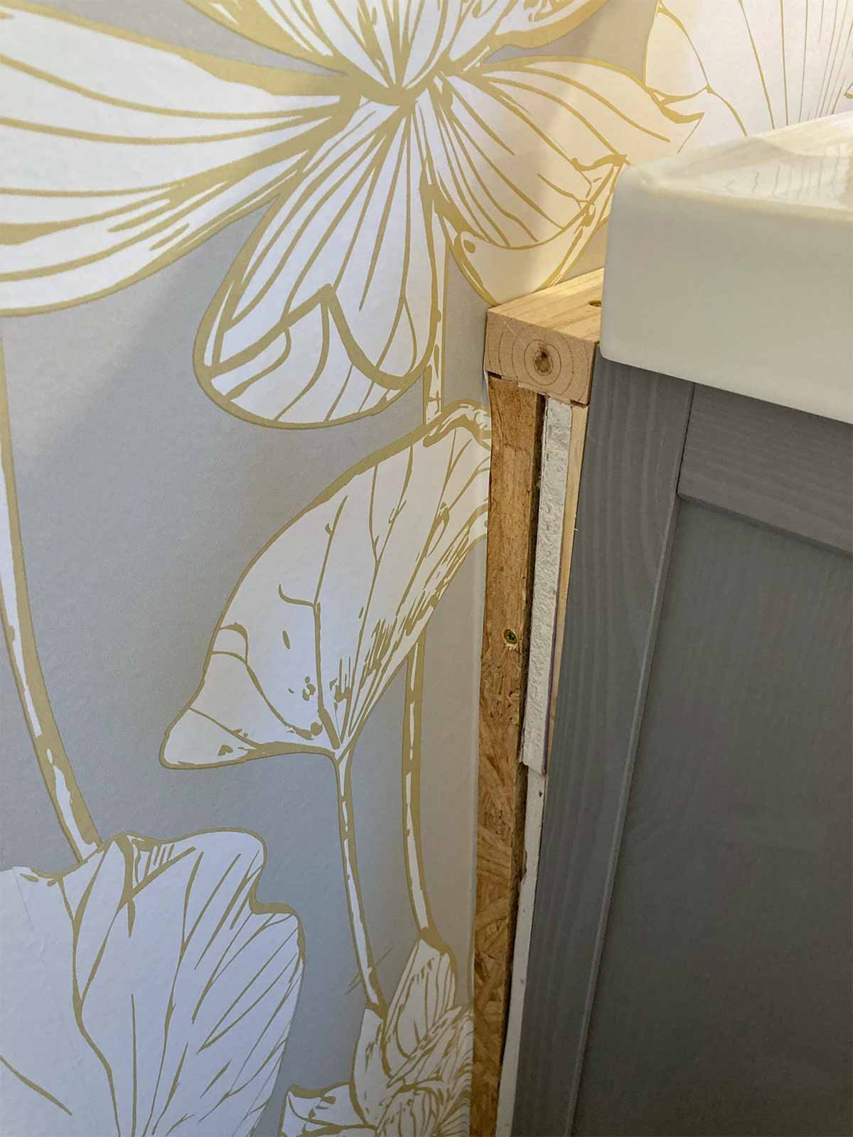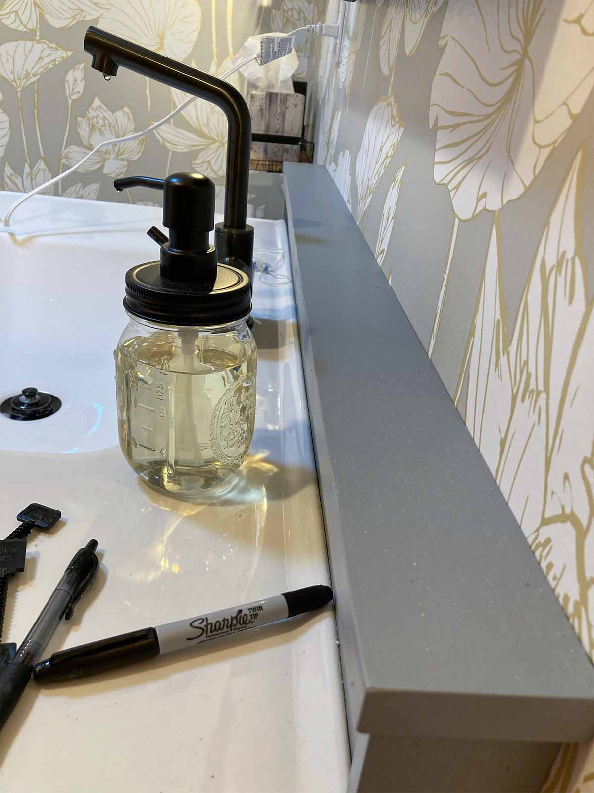 The plumbing for the vanity was inset into the room to fit insulation behind the pipes, since it is on an exterior wall. So the vanity is set away from the rest of the wall by two inches. Our sink top was purchased along with the cabinet from IKEA a year before we began this project. You can see in the pics below that we would need to come up with a solution to cover all the gaps. We originally were going to have a new sink top installed, but the cost and problems with the drawer size/drain made that not an option. I'm actually glad that didn't work because I think we now have a very unique vanity that fits into the charm of the farmhouse perfectly.