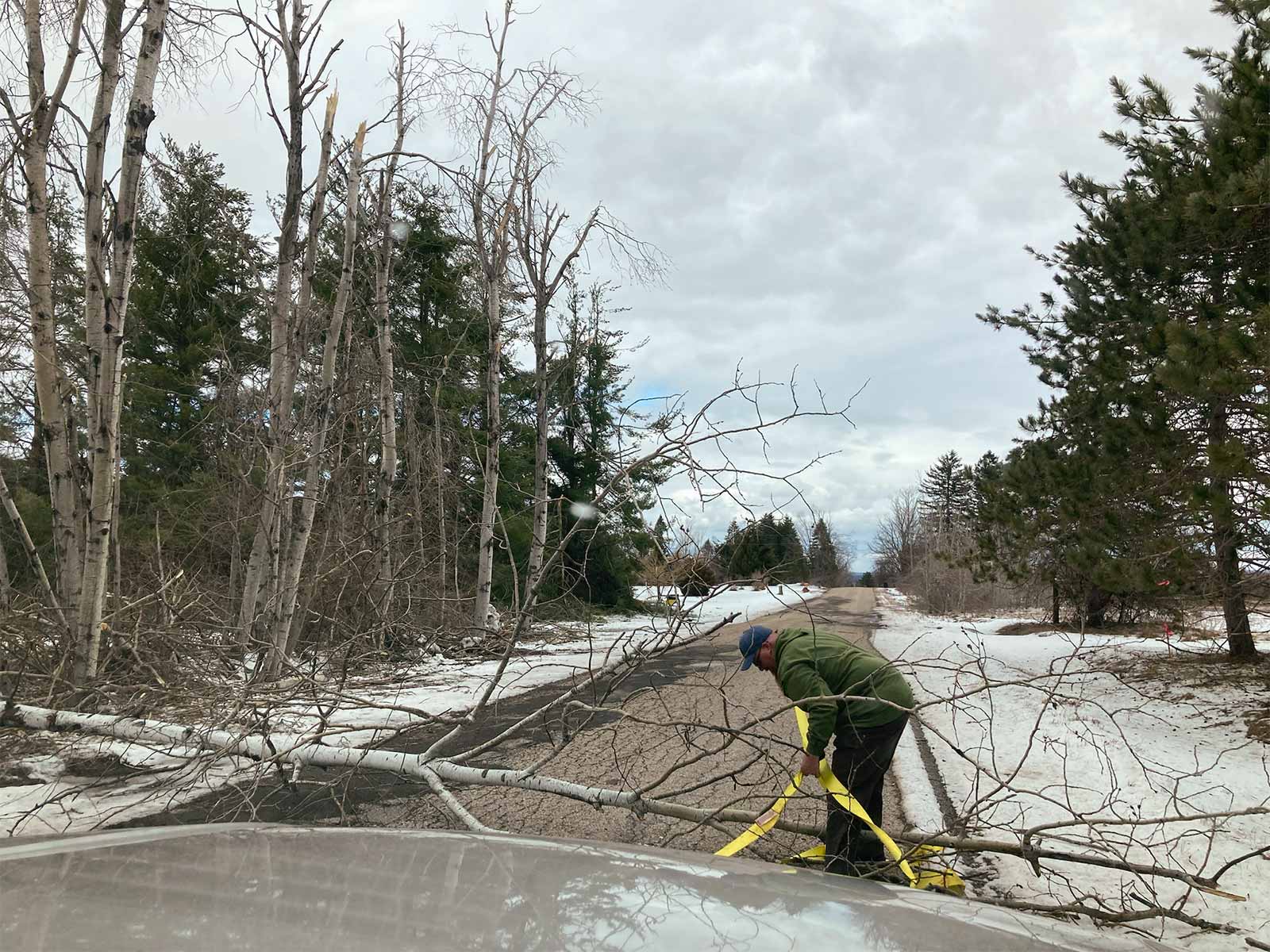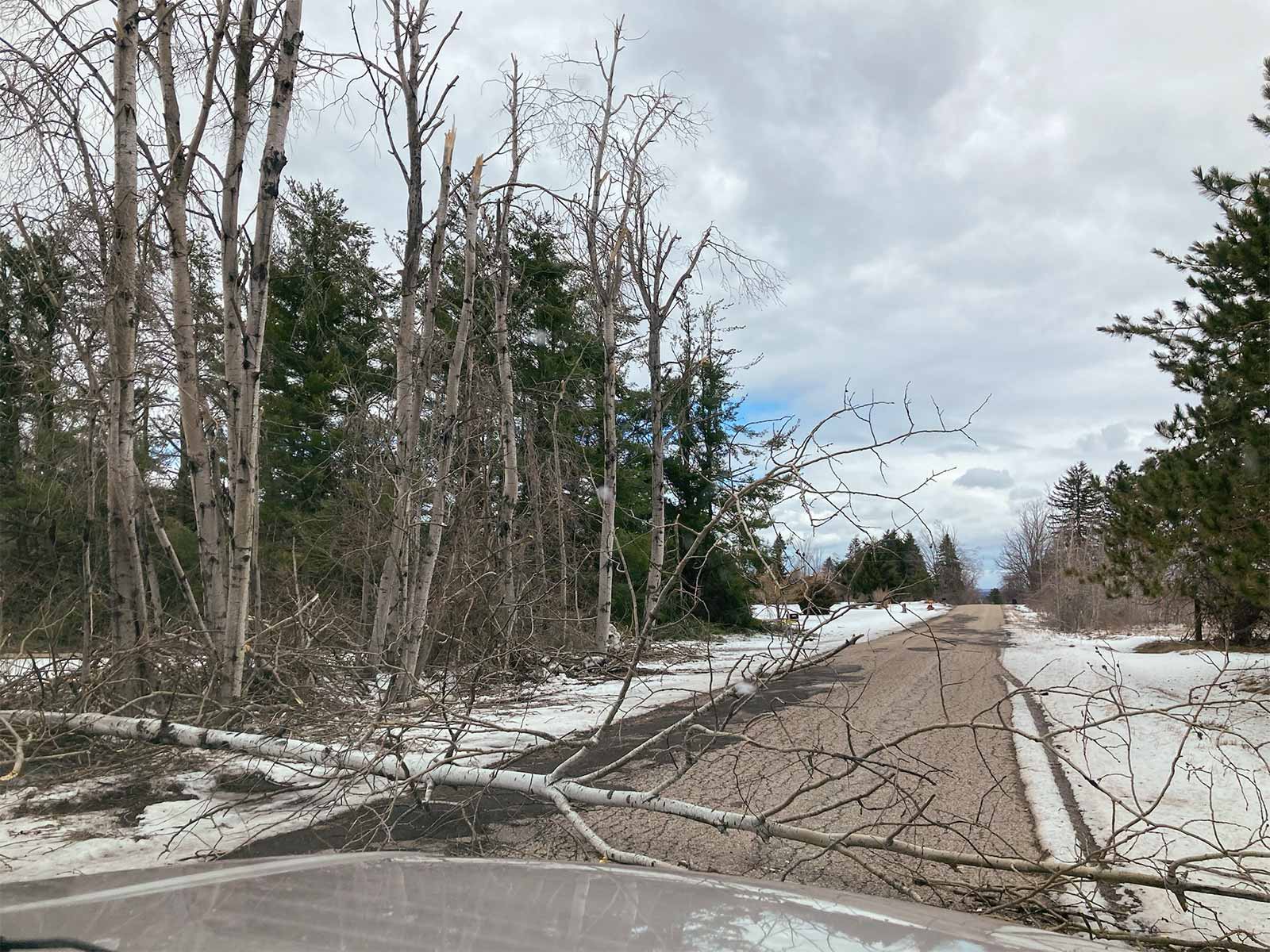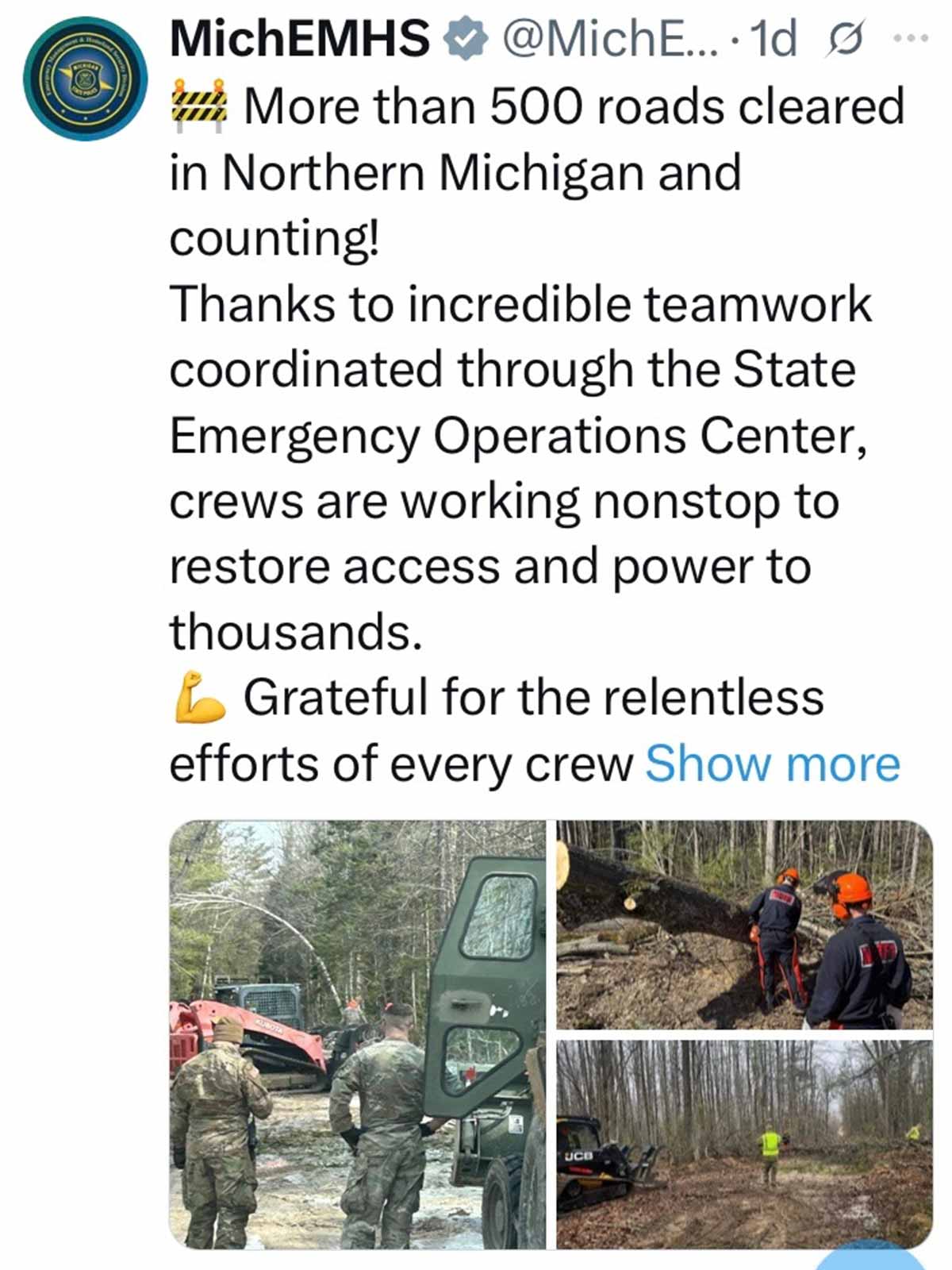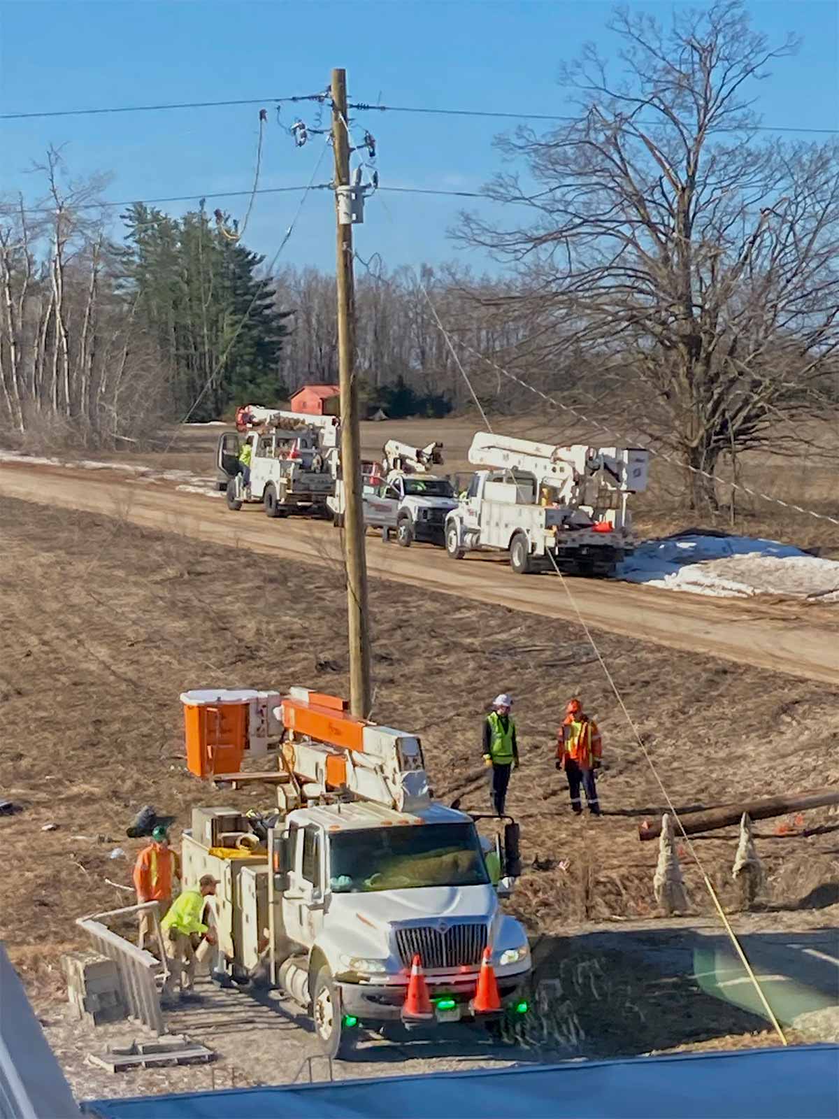 The county and municipal workers from across northern Michigan worked endless hours. Once this was declared a state emergency, state workers, as well as those from other states, and the National Guard, were coming to the rescue. A very close friend of ours had put in over 200 hours of work from Friday night through Thursday. People were providing workers with free meals, and restaurants were doing this as well. Neighbors were also helping neighbors in any way they could. By Thursday afternoon on April 3, most of Indian River had power restored. The grocery store and gas stations were back in business.