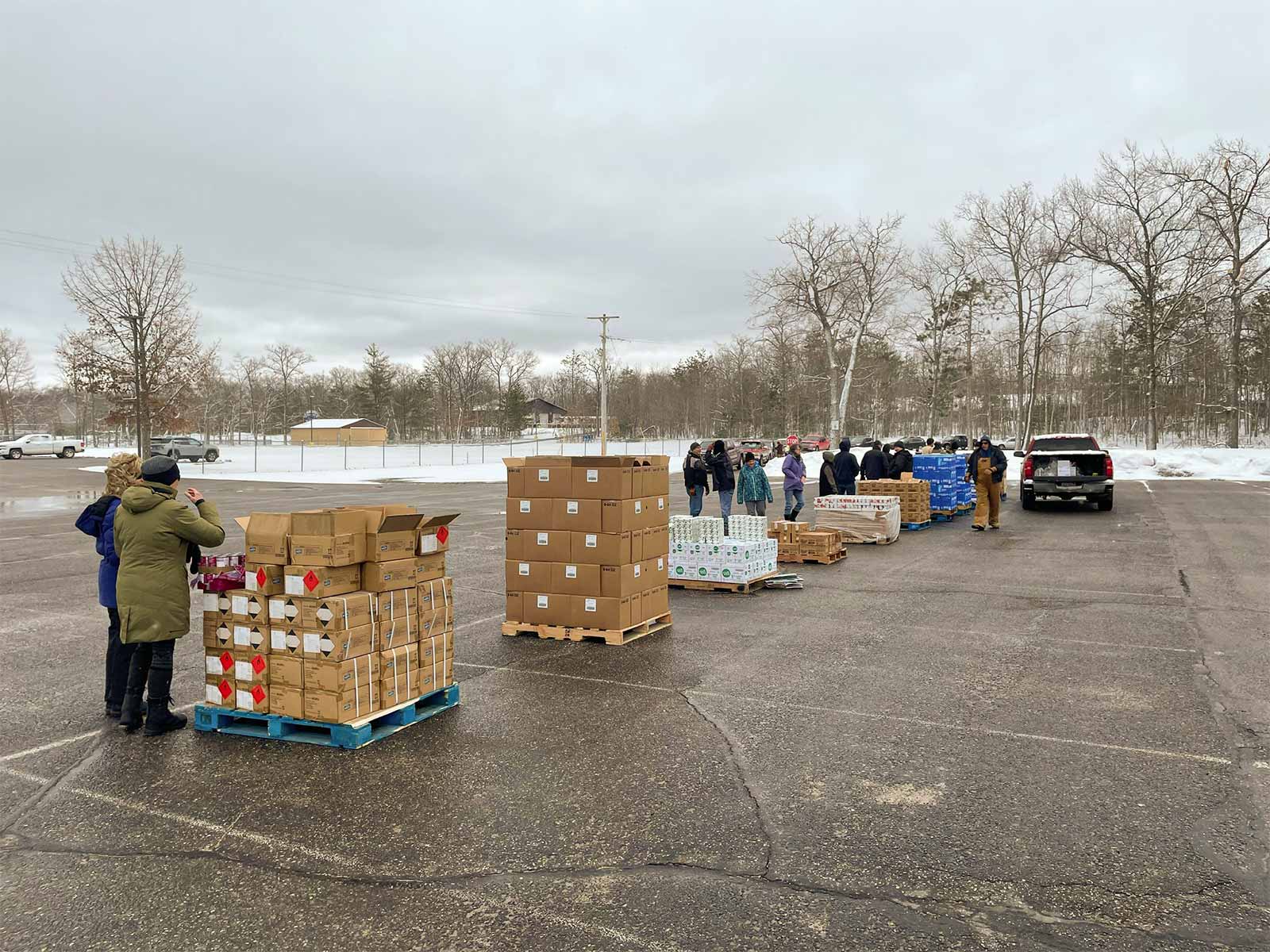 While we were at the church on Monday letting everyone know we were incommunicado at our house, Andy received a call from one of the men at the church. He said they were helping with a mobile food bank at the school and wanted to know if we would like to help. So we headed to the school and found many volunteers preparing to pass out food to those in need. Vehicles were lining up to receive items. We began with instructions and a prayer. Our station bagged and handed out apple sauce 6 packs. There were many supplies– water, snacks, canned goods, etc. It was very cold and windy!