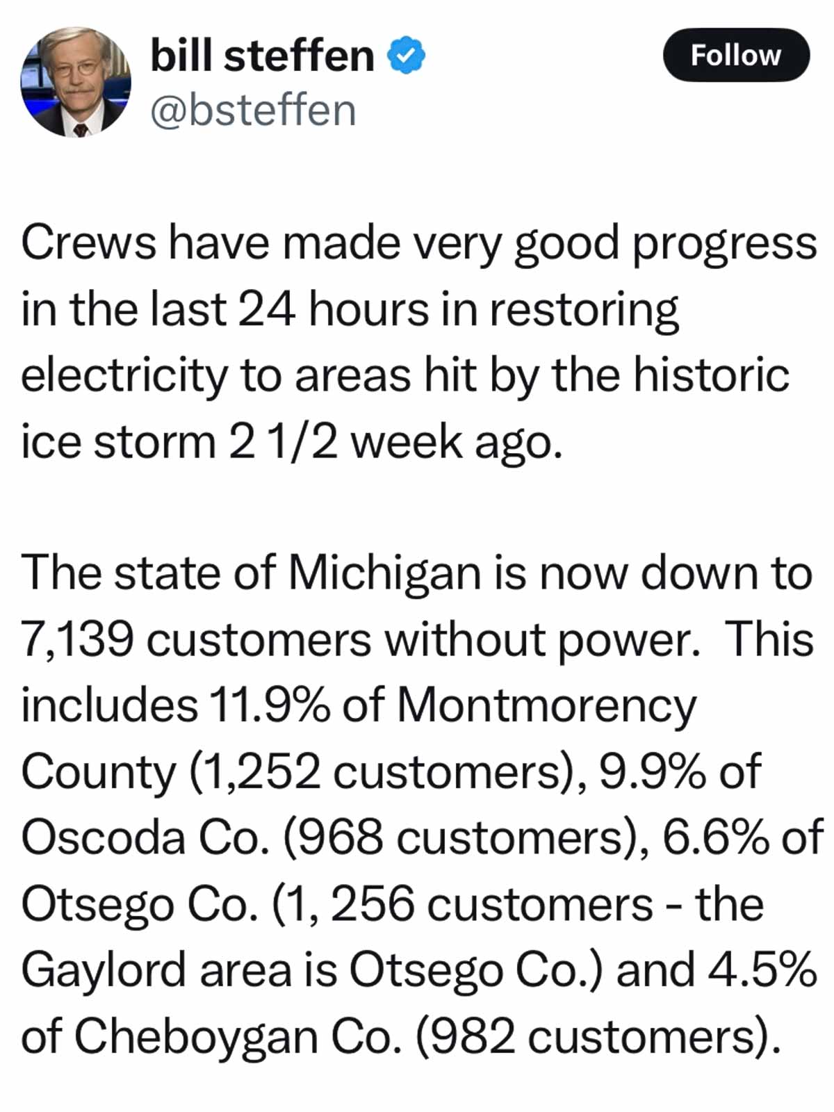 As we now have power, there are still those without power. Work is still being done. Here are a few updates: