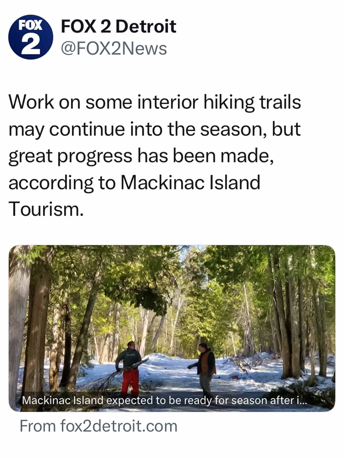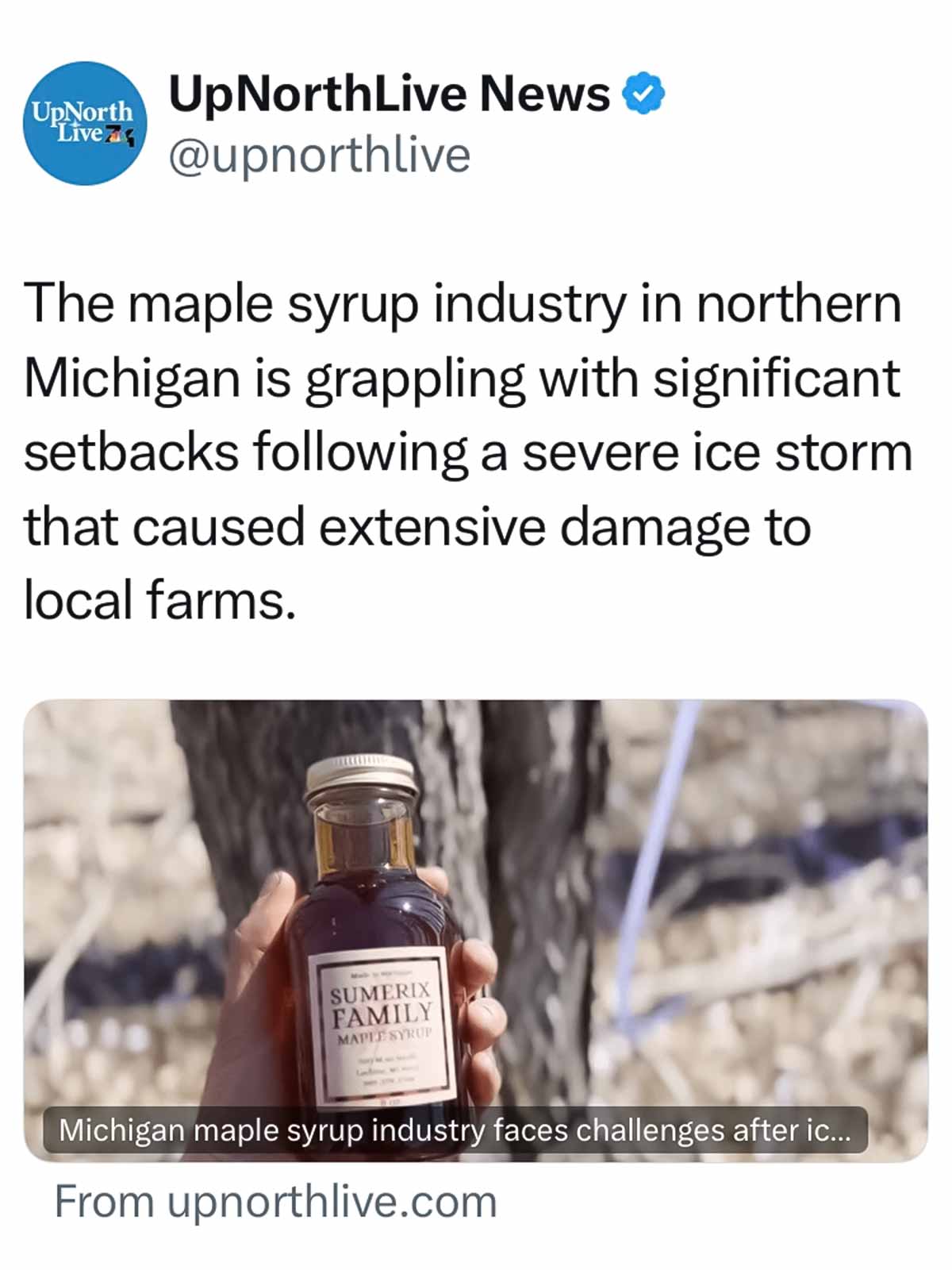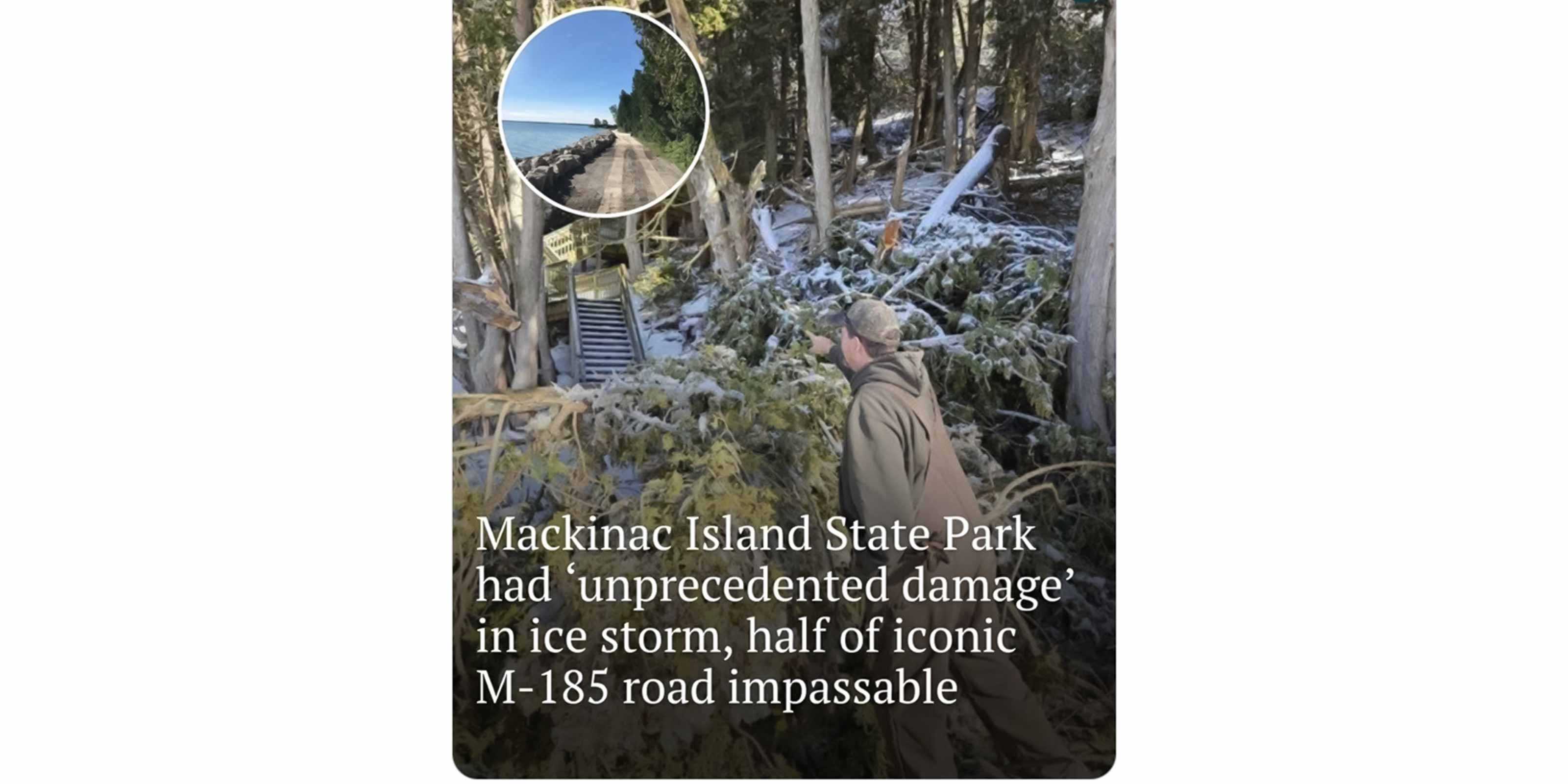Most of Mackinac Island, which is 80% State Park, is inaccessible. There is much work to be done for this popular tourist destination to reopen for the busy season. Yellow roads are clear, red are not. Other State Parks will be closed for possibly months as well. Another hard hit industry is the maple syrup farms. There is a large farm located one street over from us.