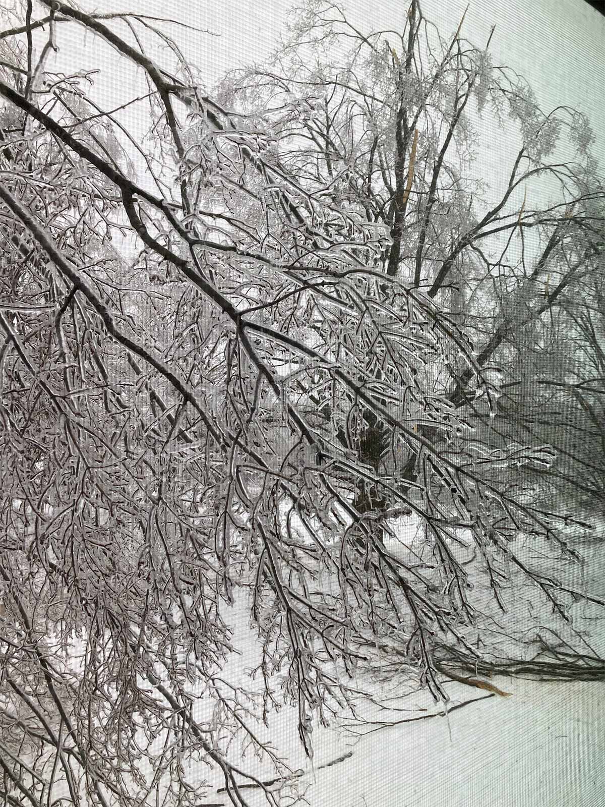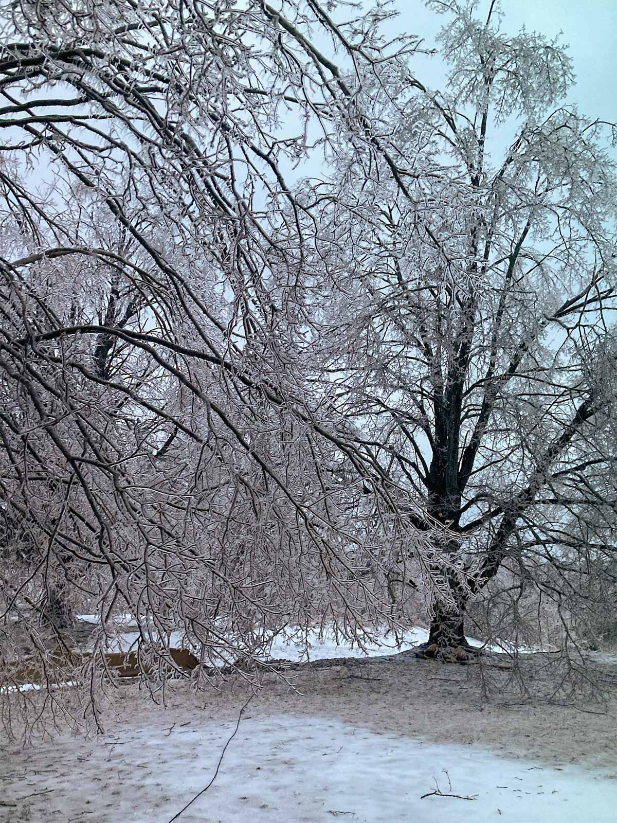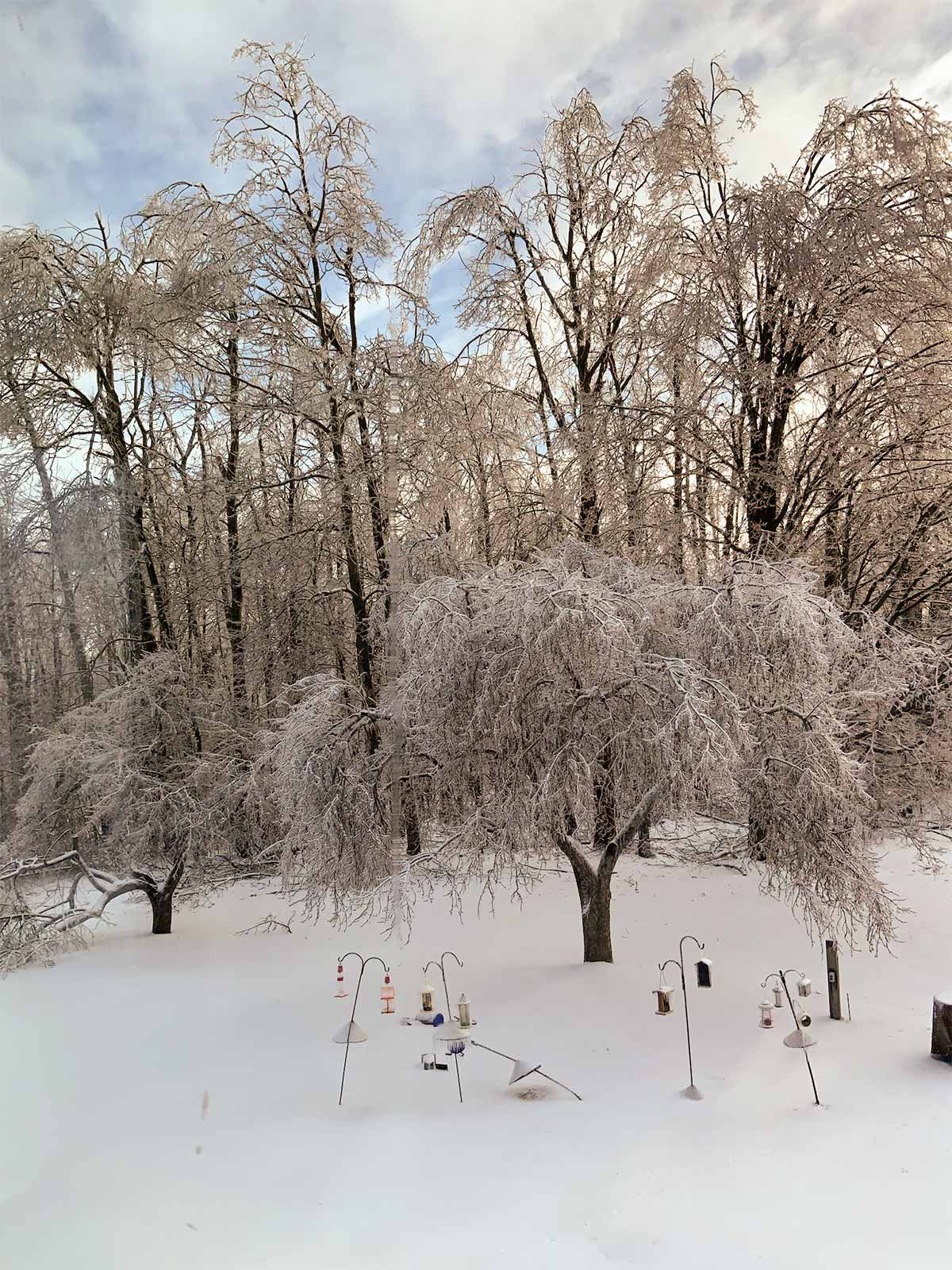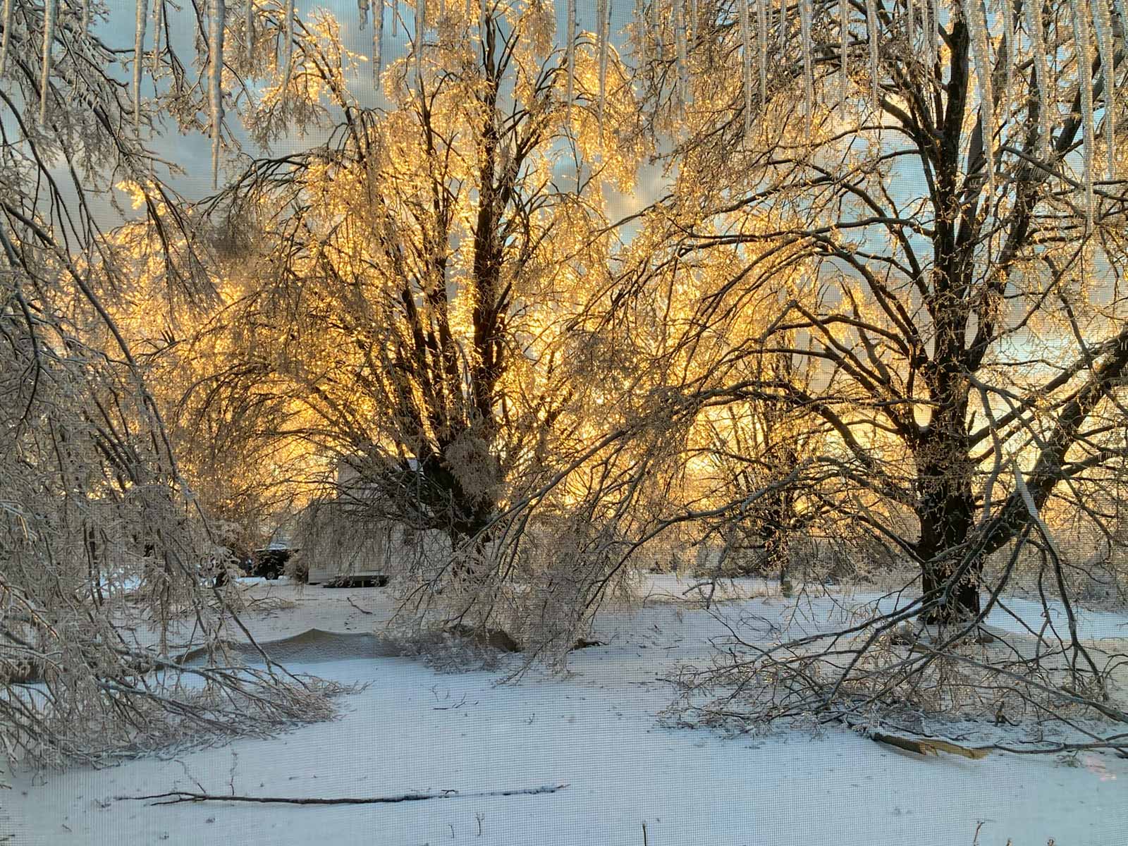 Thursday, April 3 we awakened to trees that had no remaining ice, and they began to lift back into place, after 5 days of ice! Unfortunately, that warmup brought gusting winds up to 40 mph.