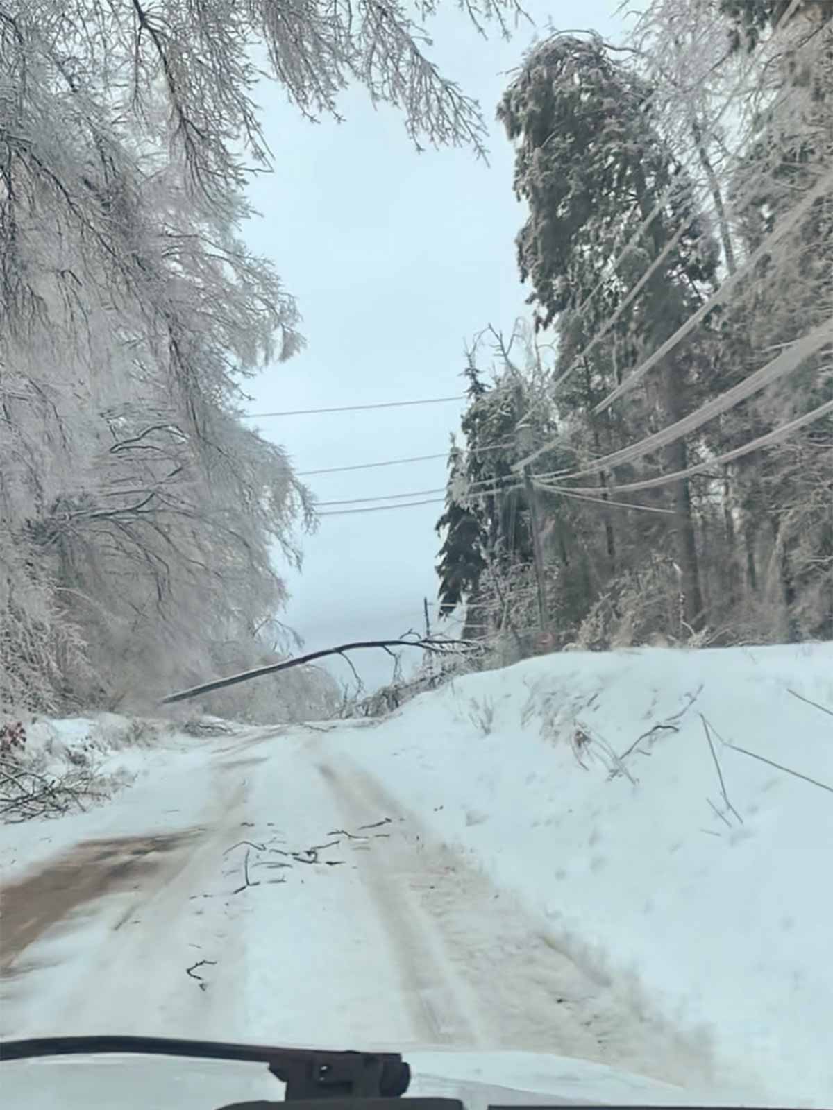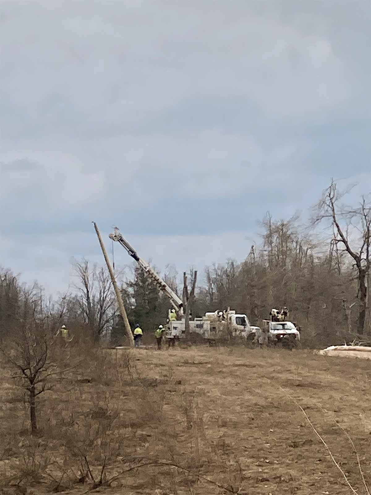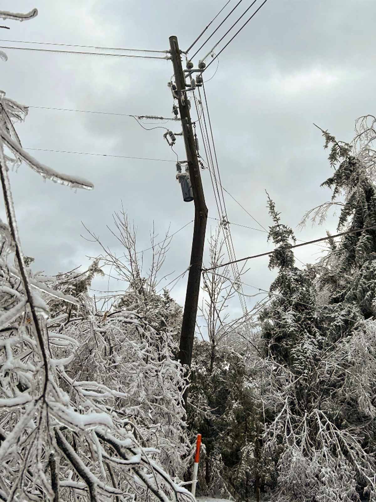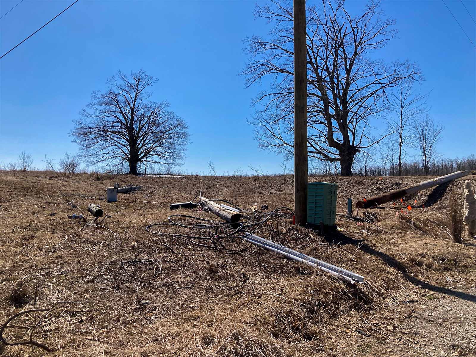 Overnight into Sunday, March 30, we heard a large crash that shook the entire house. It sounded like a tree fell on the house. When we awakened, we saw that the utility pole closest to our house was snapped in two and power lines were laying across the street. After further investigation, we found out what the crash was that we heard overnight. Our service lines had ripped off the house as the utility pole snapped. There were tree limbs down everywhere and other utility poles were ready to snap. Throughout Sunday and Monday, it sounded like gunshots in the woods as tree limbs, and trees, came crashing down.