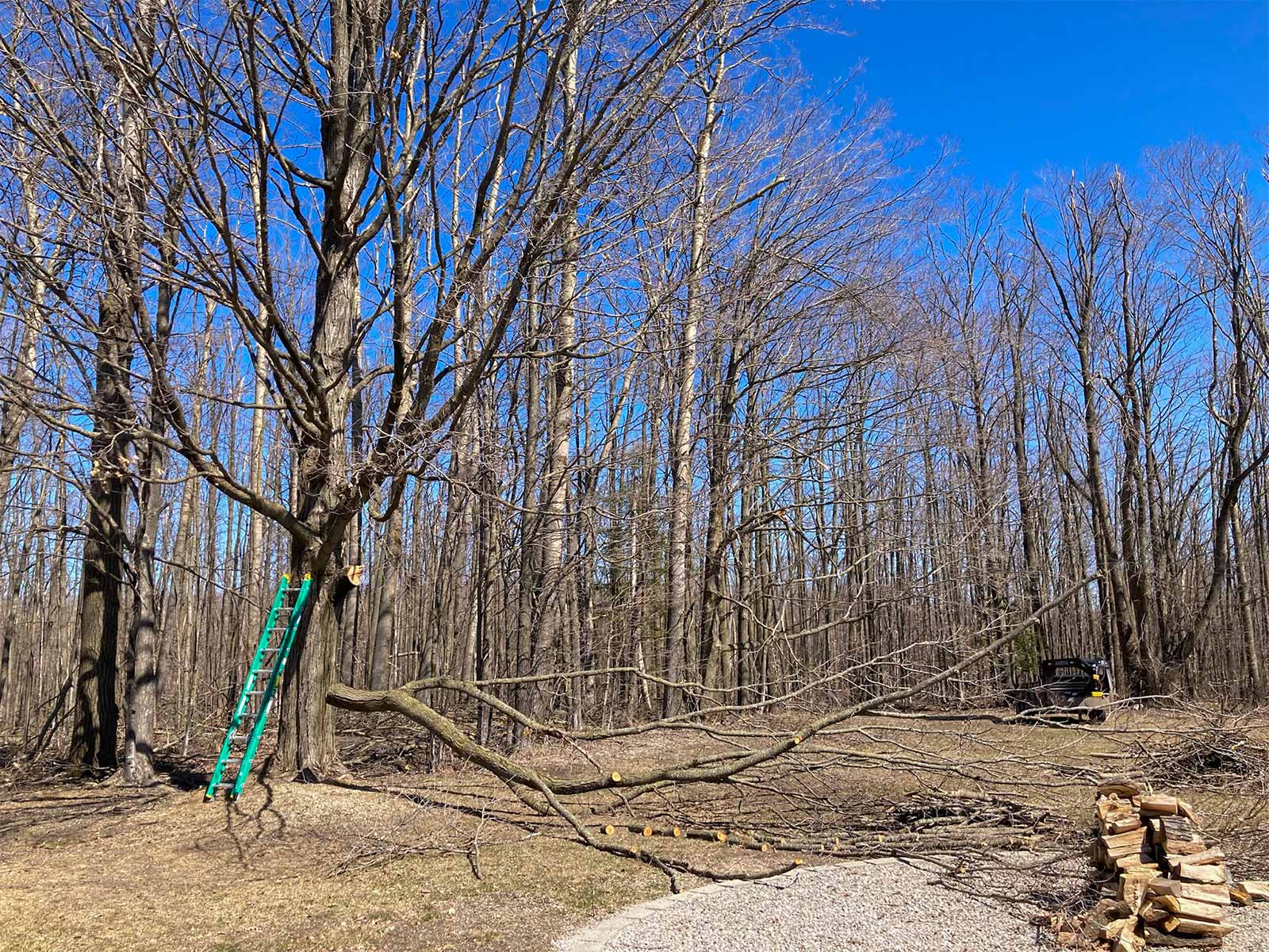 The Michigan state police asked everyone to shelter in place so crews could begin to clear roads. We have three ways we can get to the main road from our house. Each way was completely blocked by down trees and power lines. Andy got his chainsaw out on Monday and began to clear the debris from our street.
