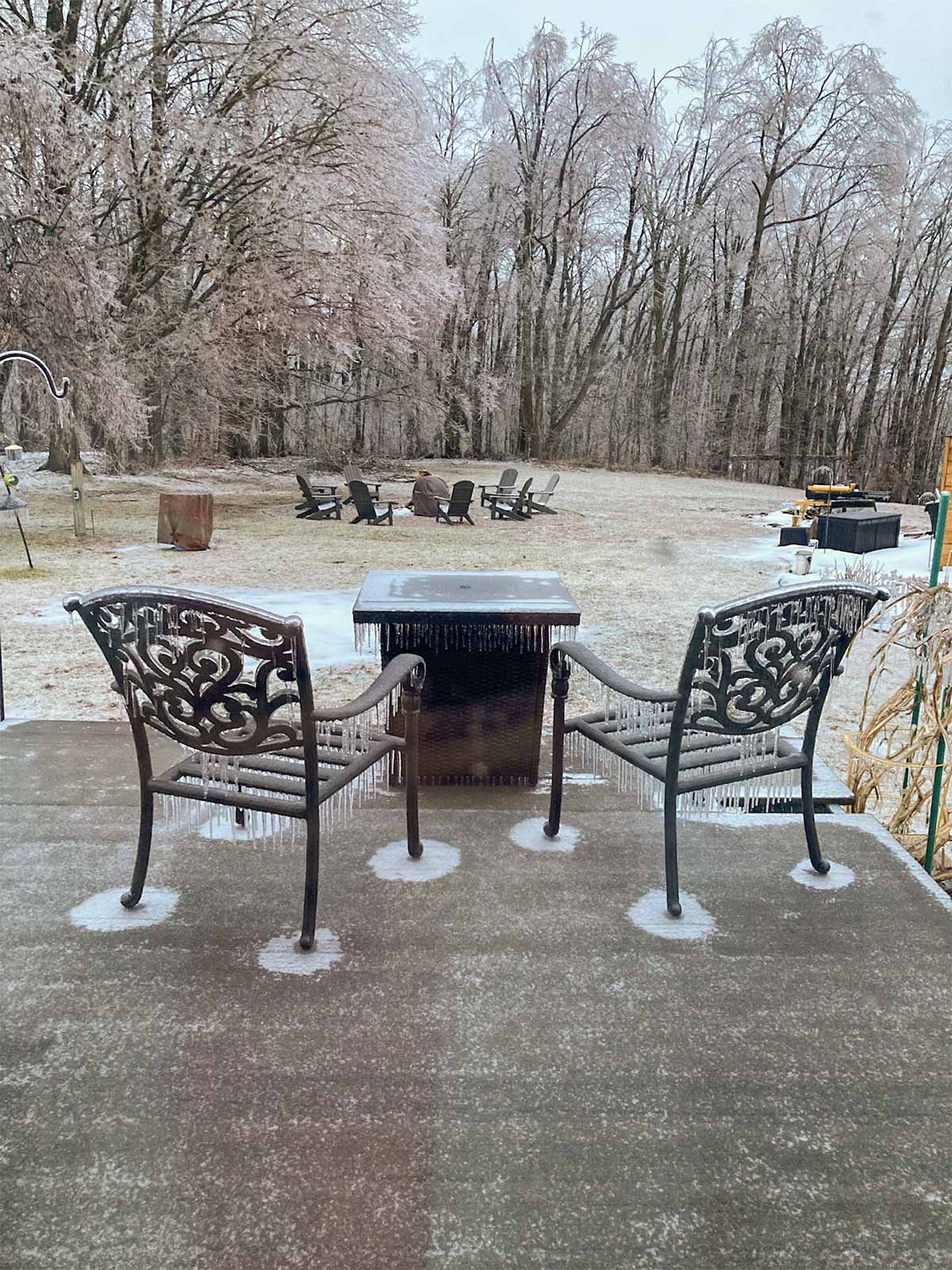 Wednesday, April 2, we had more snow with freezing rain, then rain again. The trees were still weighed down with ice from the first storm, and now more ice! Many areas that had power restored already, lost power again due to this round of weather. Overnight, we heard many sounds of ice falling from the roof and trees.