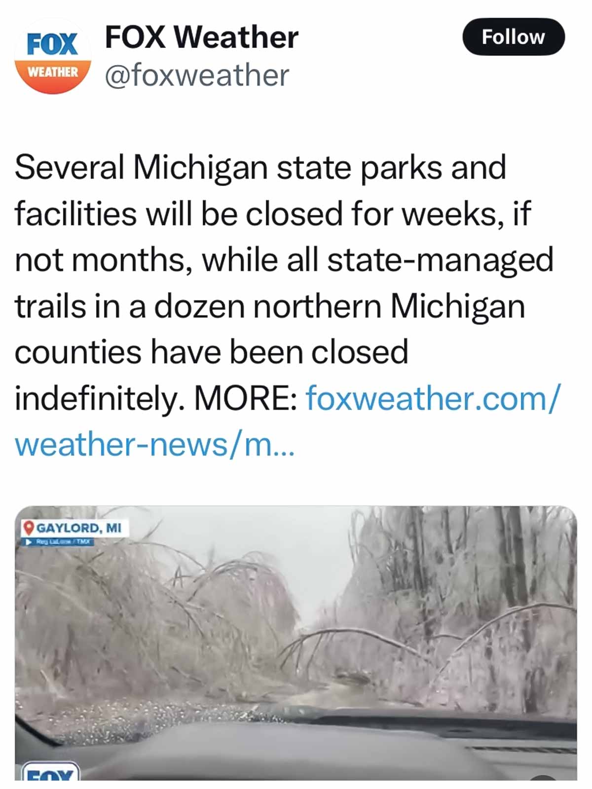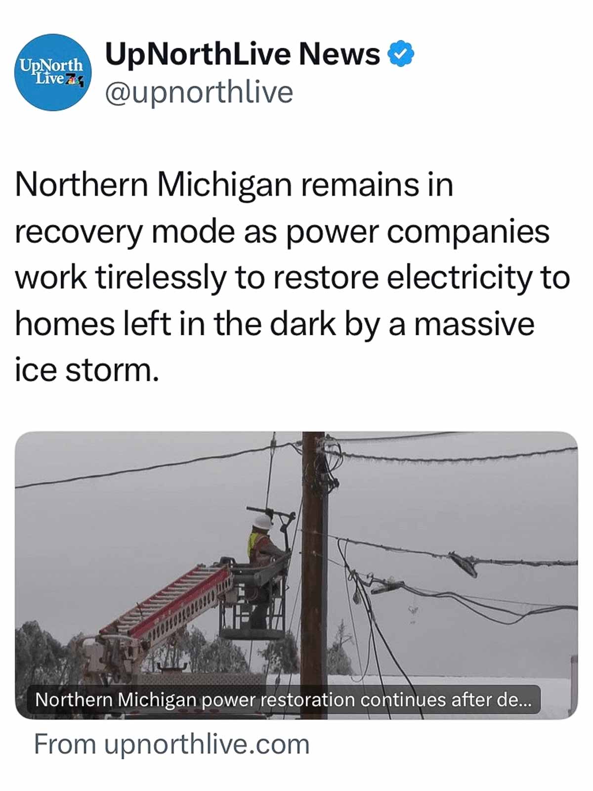 This ice storm is said to be the worst in at least 100 years. The power grid is completely destroyed. Ten counties were declared in a state of emergency by the initial storm, with an additional two counties following secondary storms. That's a huge portion of the state of Michigan.